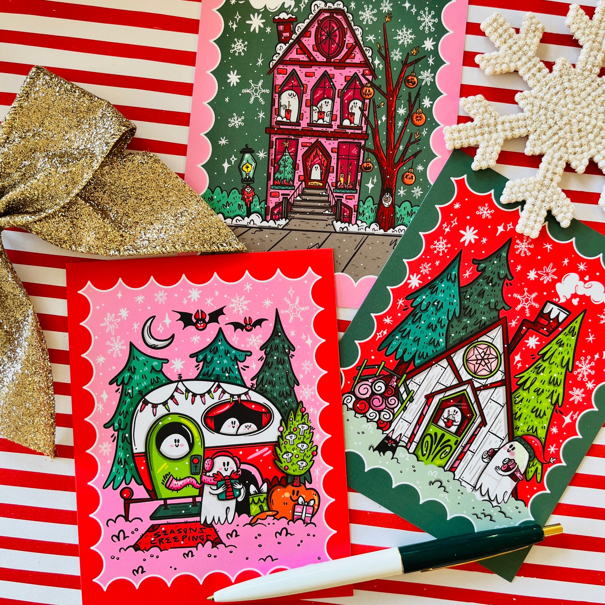 Send spooky vibes with this spooky postcard set! Featuring fun and friendly illustrations from Lydia Jean Art — These postcards are perfect for mailing to friends, decorating your space, or adding to your stationery collection. Each set includes 6 postcards printed on sturdy matte cardstock. Great for sending greetings, party invites, or just treating yourself to some spooky cute art!