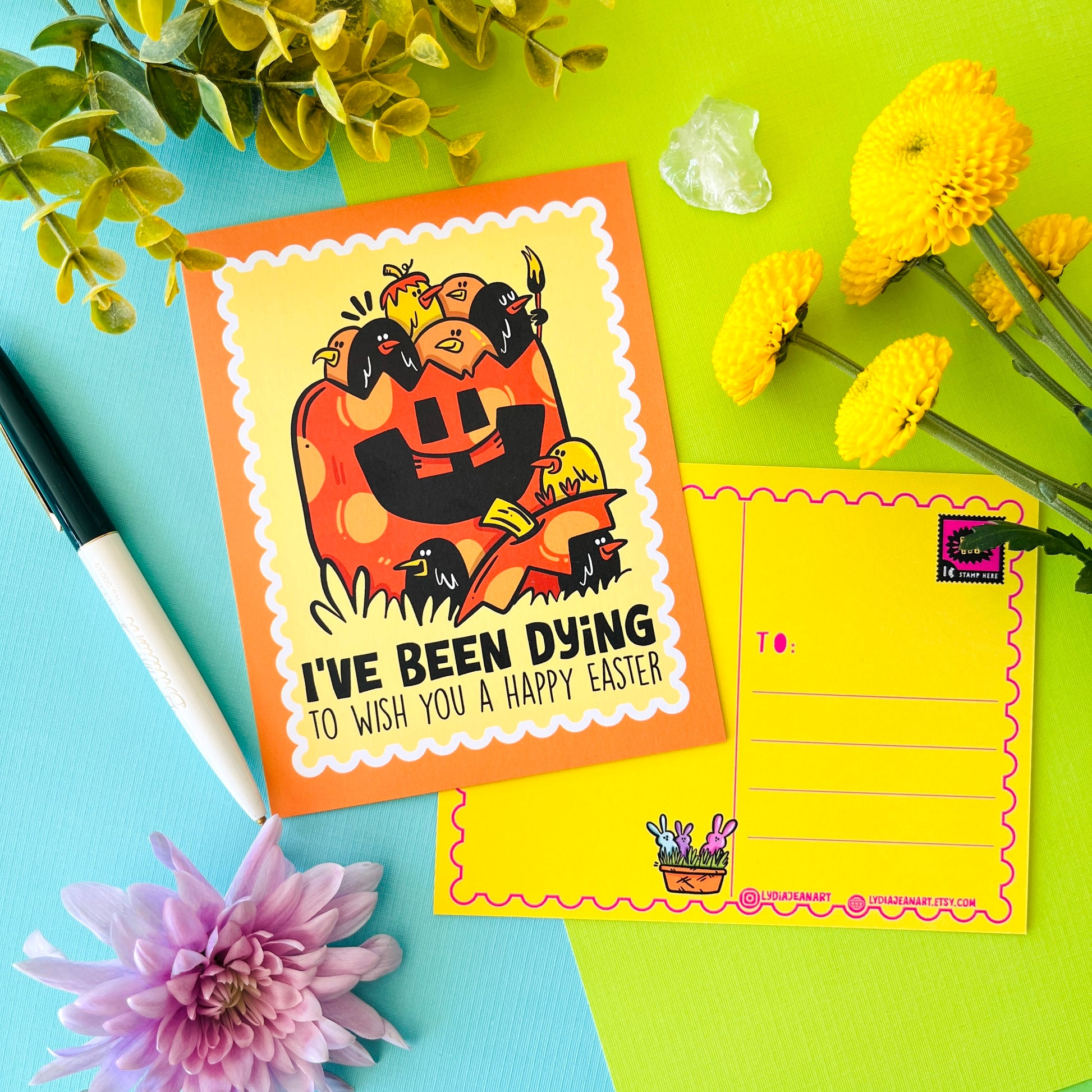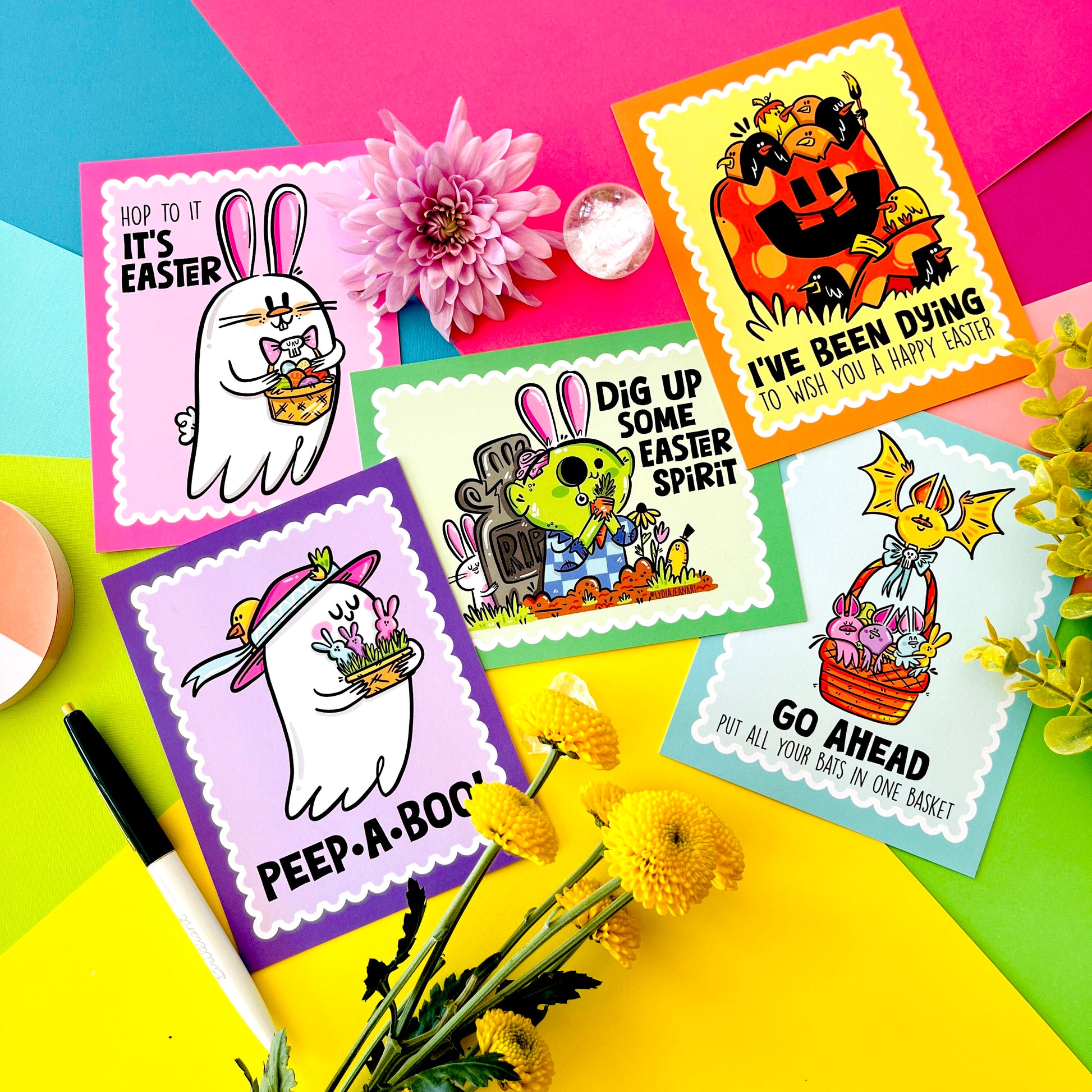 Send spooky vibes with this spooky postcard set! Featuring fun and friendly illustrations from Lydia Jean Art — These postcards are perfect for mailing to friends, decorating your space, or adding to your stationery collection. Each set includes 5 postcards printed on sturdy matte cardstock. Great for sending greetings, party invites, or just treating yourself to some spooky cute art!